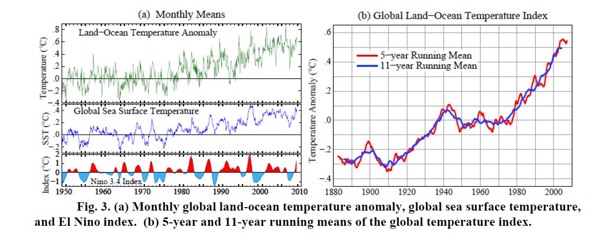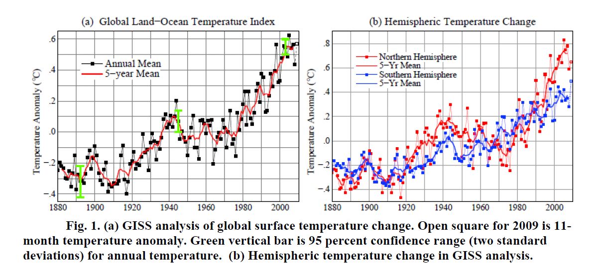 Temperature data – example of early inferences. Figure 1 shows the current GISS analysis of global annual-mean and 5-year running-mean temperature change (left) and the hemispheric temperature changes (right). These graphs are based on the data now available, including ship and satellite data for ocean regions.