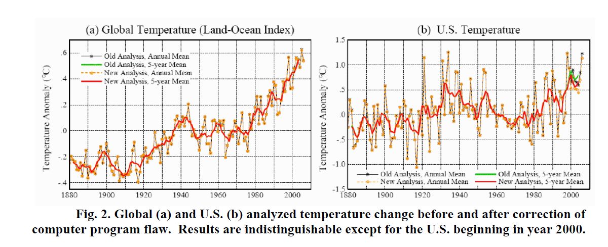 Flaws in temperature analysis. Figure 2 illustrates an error that developed in the GISS analysis when we introduced, in our 2001 paper, an improvement in the United States temperature record. The change consisted of using the newest USHCN (United States Historical Climatology Network) analysis for those U.S. stations that are part of the USHCN network. This improvement, developed by NOAA researchers, adjusted station records that included station moves or other discontinuities. Unfortunately, I made an error by failing to recognize that the station records we obtained electronically from NOAA each month, for these same stations, did not contain the adjustments. Thus there was a discontinuity in 2000 in the records of those stations, as the prior years contained the adjustment while later years did not.